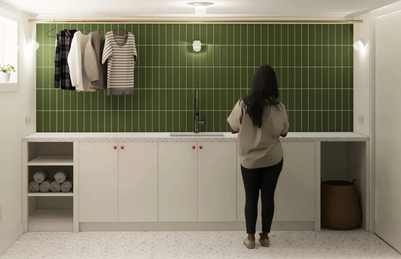 Full basement finishing: Creating a bedroom, storage, full bath, laundry, and utility room in the basement.