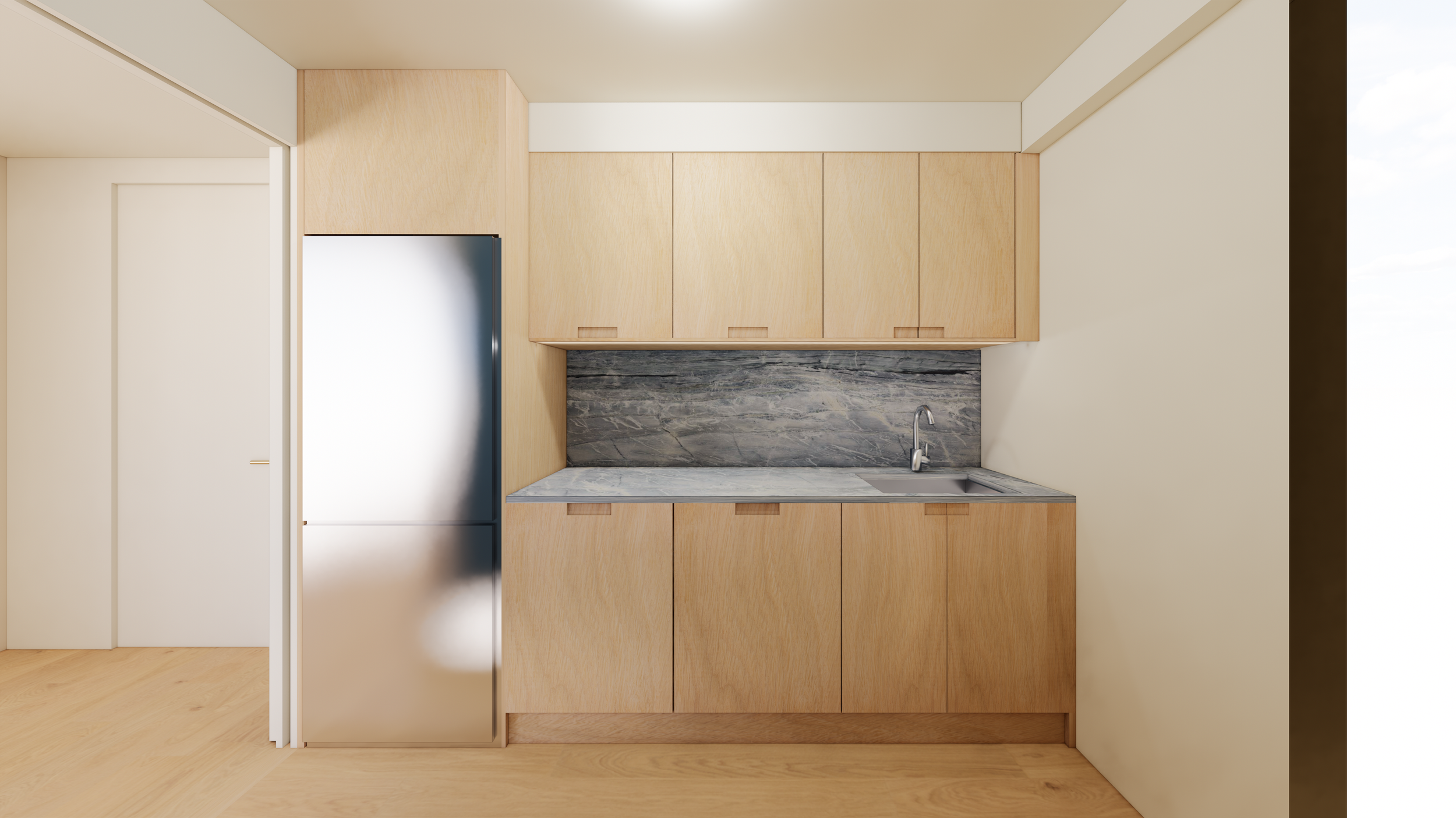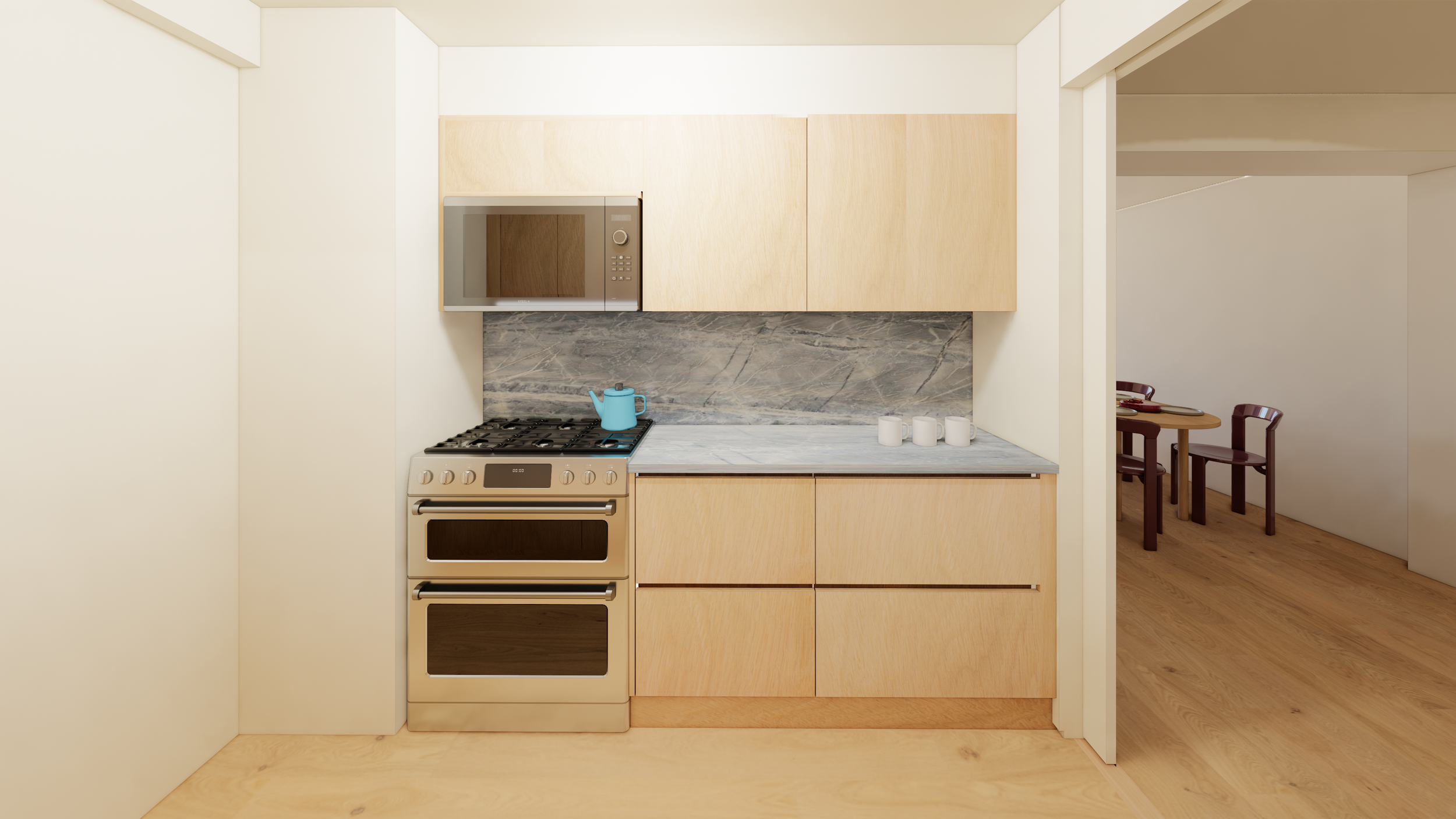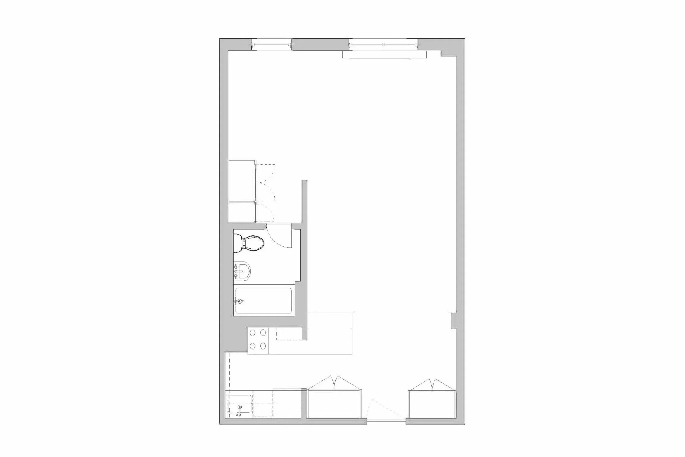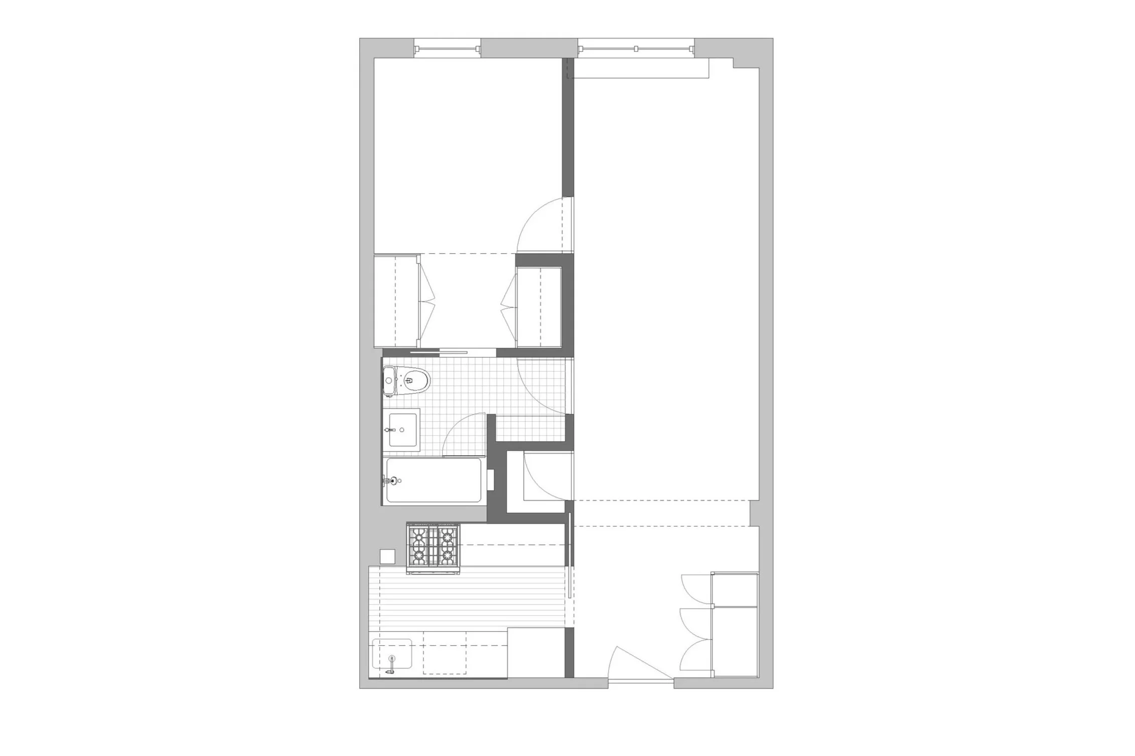This project is a complete renovation of a very small 520 SF studio apartment in a 1960s co-op building. The design maximizes the space through the introduction of a single element: a “thick” millwork wall, which adds storage while creating distinct living, bedroom, and bathroom spaces.